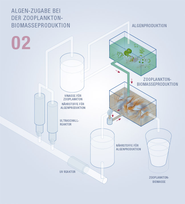 (1) Beschallung von Roh-Vinasse mit dem Weber Ultraschallreaktor VinPush 5000 und Fütterung des Zooplanktons mit Vinasse/Hefe.