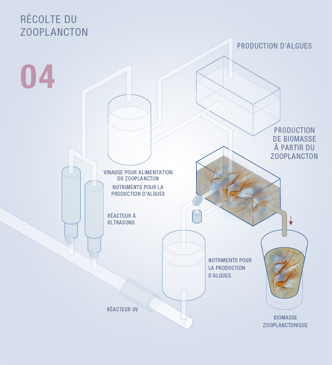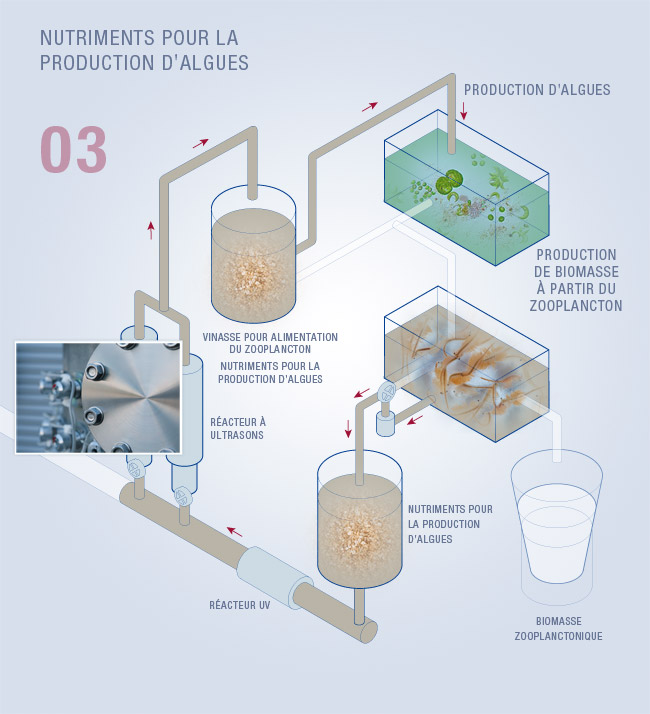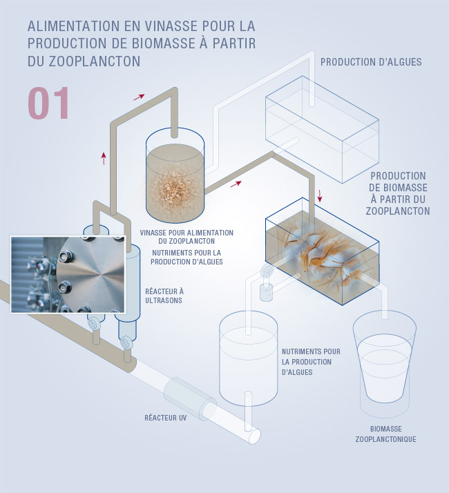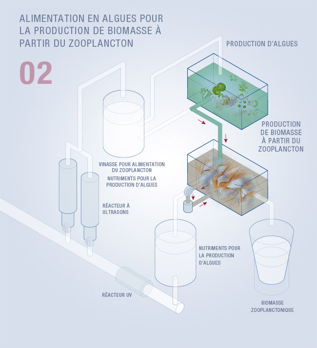 (1) Traitement par ultrasons de la vinasse brute par le réacteur Weber VinPush 5000 Ultrasonic et alimentation du zooplancton avec la vinasse/levure.